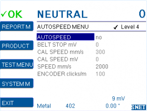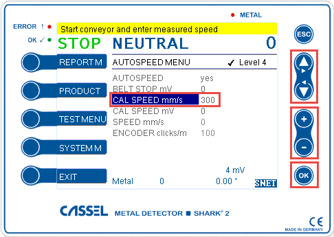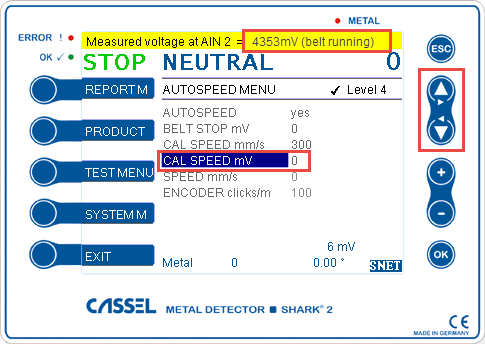 Start the conveyor at speed same as CAL SPEED mm/s. Take over the mV from the yellow notification bar by pressing at once + /- .