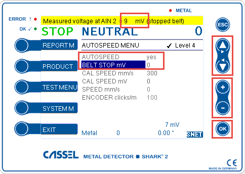 Stopp the conveyor. Take over the mV from the yellow notification bar by pressing at once + /- .