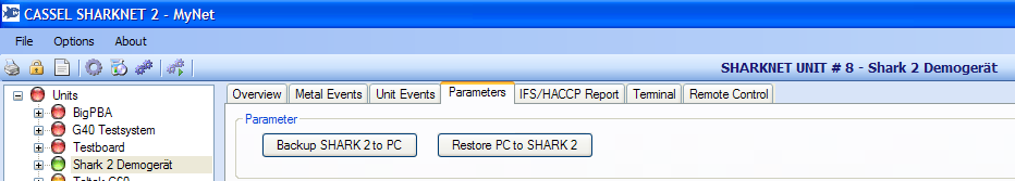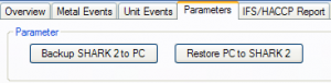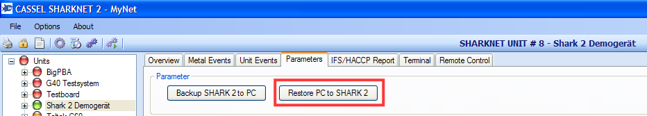 1.) Select the SHARK 2 unit for which the settings configuration is to be restored and then select the ‘Parameters’ tab page. The following screen will appear: