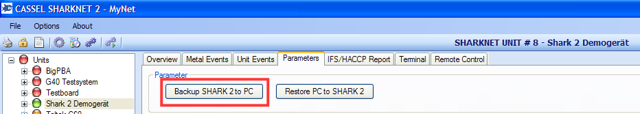 The following document describes how to save and restore all parameters (global parameters and product settings) from a SHARK 2 unit using the SHARKNET 2 software. This feature is available in SHARKNET 2 since version V1.0.1.29 and requires a SHARK 2 software version V1.16x or higher.
