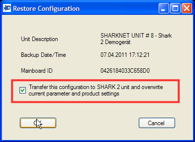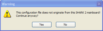 7.) If the selected configuration file is not from the same SHARK 2 unit, another warning message is shown. You should only continue here, if the main board of this unit was just changed and the settings are to be restored. In all other cases you should not continue pressing ‘No’.