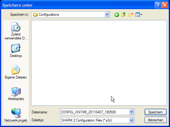 4.) Press the Save button to store the settings to a configuration backup file. The SHARKNET 2 software will automatically generate a default name based on the SHARKNET UNIT# and the current date and time. The SHARK 2 configuration files use a special extension of *.s2c.