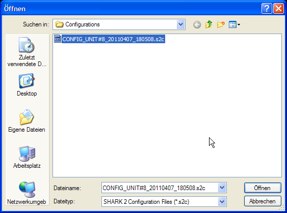 5.) After pressing ‘OK’ a file open dialog will be shown that allows the selection of a saved configuration. Select the configuration file (*.s2c) that should be used to restore the settings configuration and click the ‘Open’ button.
