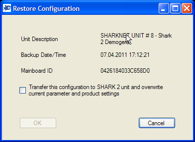 The complete parameter settings of a unit can be saved in a file on the PC running the SHARKNET 2 software. This file can later be used to restore the parameter settings of the SHARK 2 unit to its previous values.