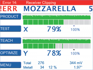 Signal amplitude from the receiver coil is very much too large. The large signal must occur for a longer time. The time depends on the conveyor speed and is how long it takes for the product to move approx 64x of the tunnel height or width (whateveer is the smaller dim).