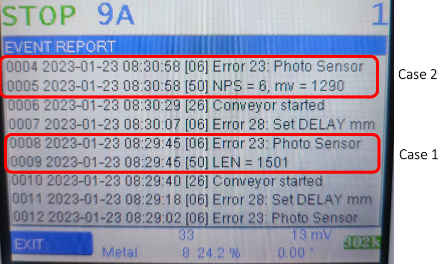 LEN = 1501 tells that the photo beam got interrupted for the duration that is equal to a conveyor forward moving length of 1501 mm. The length is calculated from the metal detector SPEED mm/sec setting.