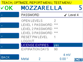 Password menu is accessible. When the user tries to edit one of the license parameters, the license code must be entered. When the license code is correct, the parameter LICENSE EXPIRES is set to NO. The parameters can not be edited.