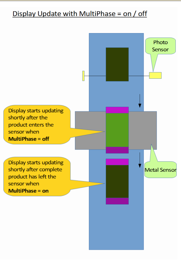 With MULTIPHASE = on the screen content appears delayed. The signal only appears once the product has completely passed through the sensor head tunnel.