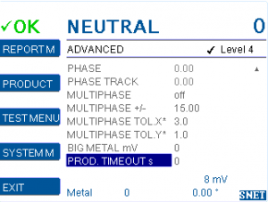 Timeout starts when changing to another product number. During the timeout the detection sensitivity is set to BIG METAL mV and the output PRODUCT TIMEOUT (IN/OUT MENU) is enabled. After the timeout sensitivity will be reset to taught sensitivity.