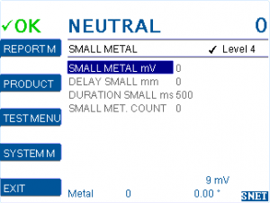 Small metal contaminations can remain in the product without causing any damage to presses. These small contaminations can cause problems in a microwave installed after the BIGpba metal detector. The correct settings in SMALL METAL MENU allows to detect the small contaminations. This detection generates an output signal to suppress the microwaves without triggering a reject.