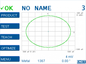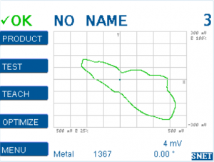 TEACHAREA MODE | Allows to switch between normal teacharea (contour of product effect) and ellipse (the enclosing ellipse of the product effect) The parameter can be changed ‘on the fly’ switching between both without need of reteaching. Contour: Real product effect will be taught. All signals with higher mV values will cause metal alarms. Typical teach setting for products with stable product effect. Teacharea after switching to contour ![]() Ellipse: A certain sensitivity is choosen and the related ellipse is taught. All signals with higher mV values will cause metal alarms. Ellipse will ensure that always the same quality/sensitivity can be reached. Typical setting for products with variable product effect (e.g. depending on batches). The setting may cause higher quantity of rejected product without contamination due to differing product effect. Teacharea after switching to ellipse ![]() |
