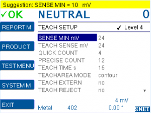 TEACH SENSE mV | Blanks out signals that are smaller than this value. TEACH SENSE mV prevents the metal detector from recognizing e.g. noises as products. It should be at least the value of SENSE MIN mV. Signals that are bigger are identified as products. Set this parameter as the yellow help text indicates. Range: 3 – 2,000 |